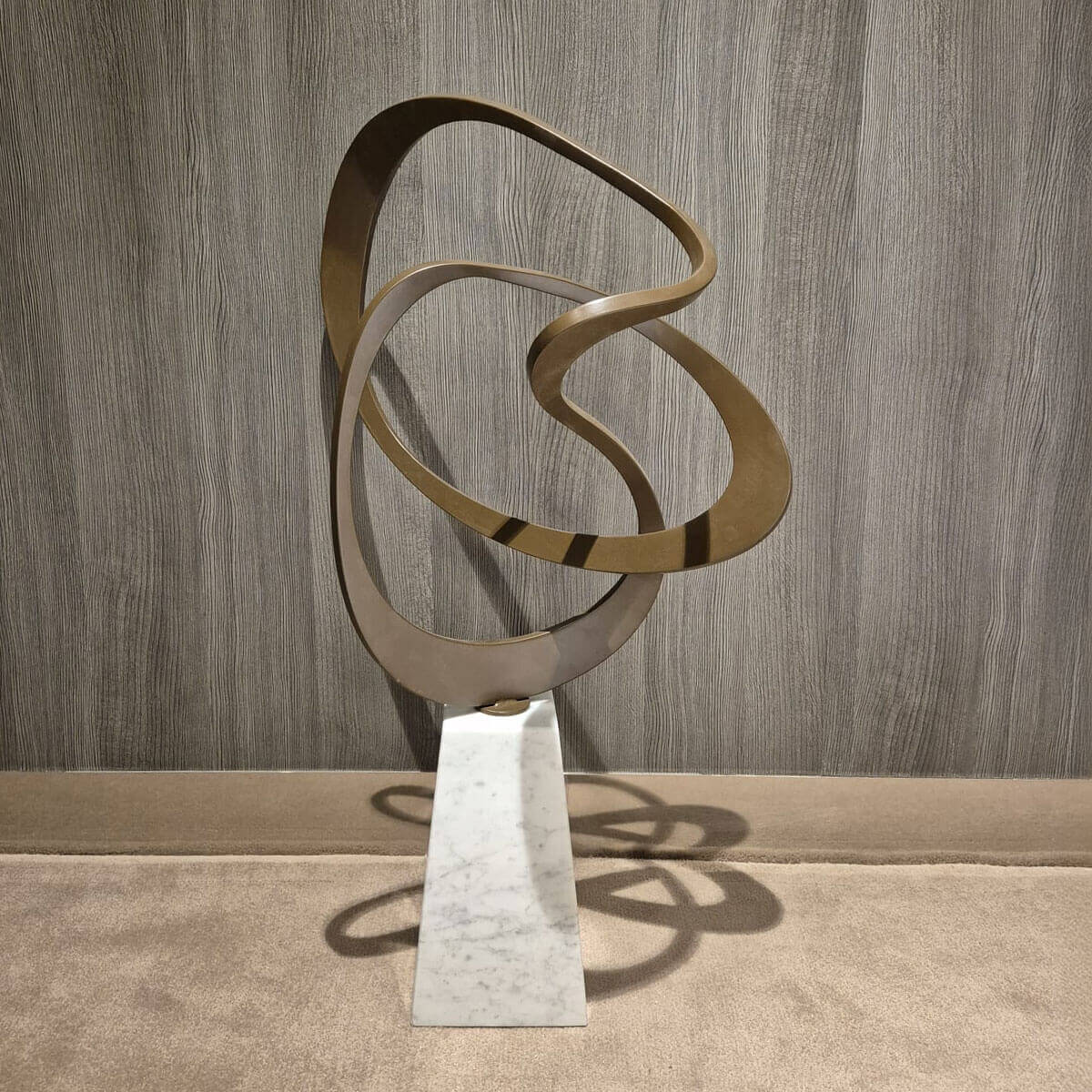 An abstract aluminium sculpture defined by continuous looping lines and vertical balance. Elevated on a high base, its knot-like form creates a light yet dynamic presence within contemporary interiors.