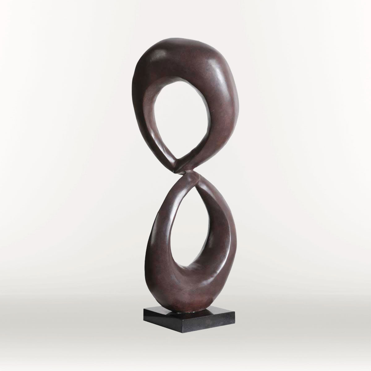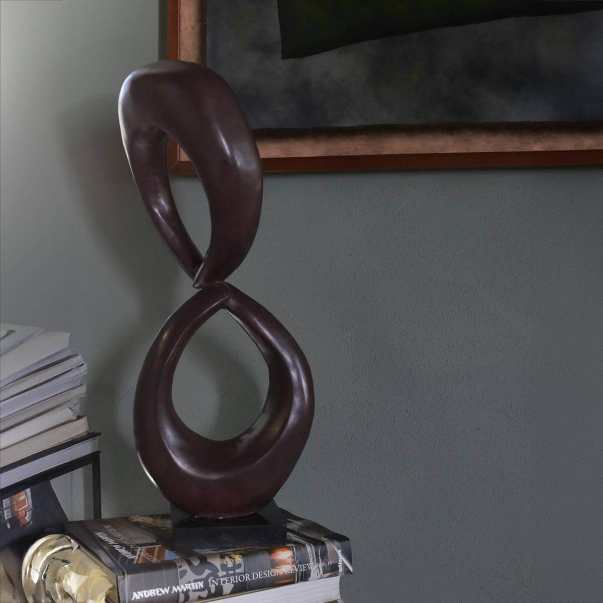An abstract sculptural form composed of interlocking rings and softened contours. The bordeaux bronze finish lends richness and intensity, creating an elegant focal point in contemporary settings.