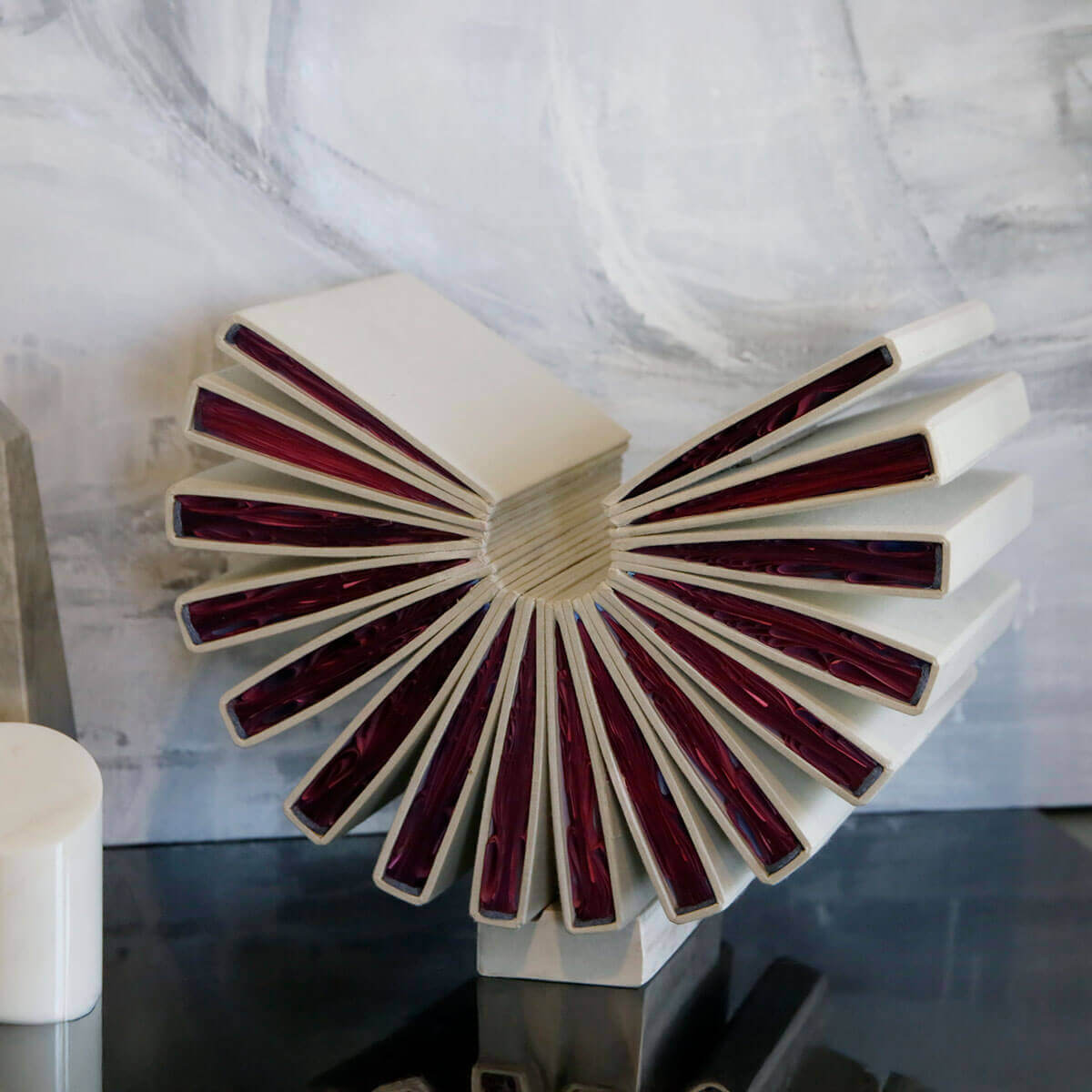 Objects. Cloth-covered cardboard, crimson-colored pages