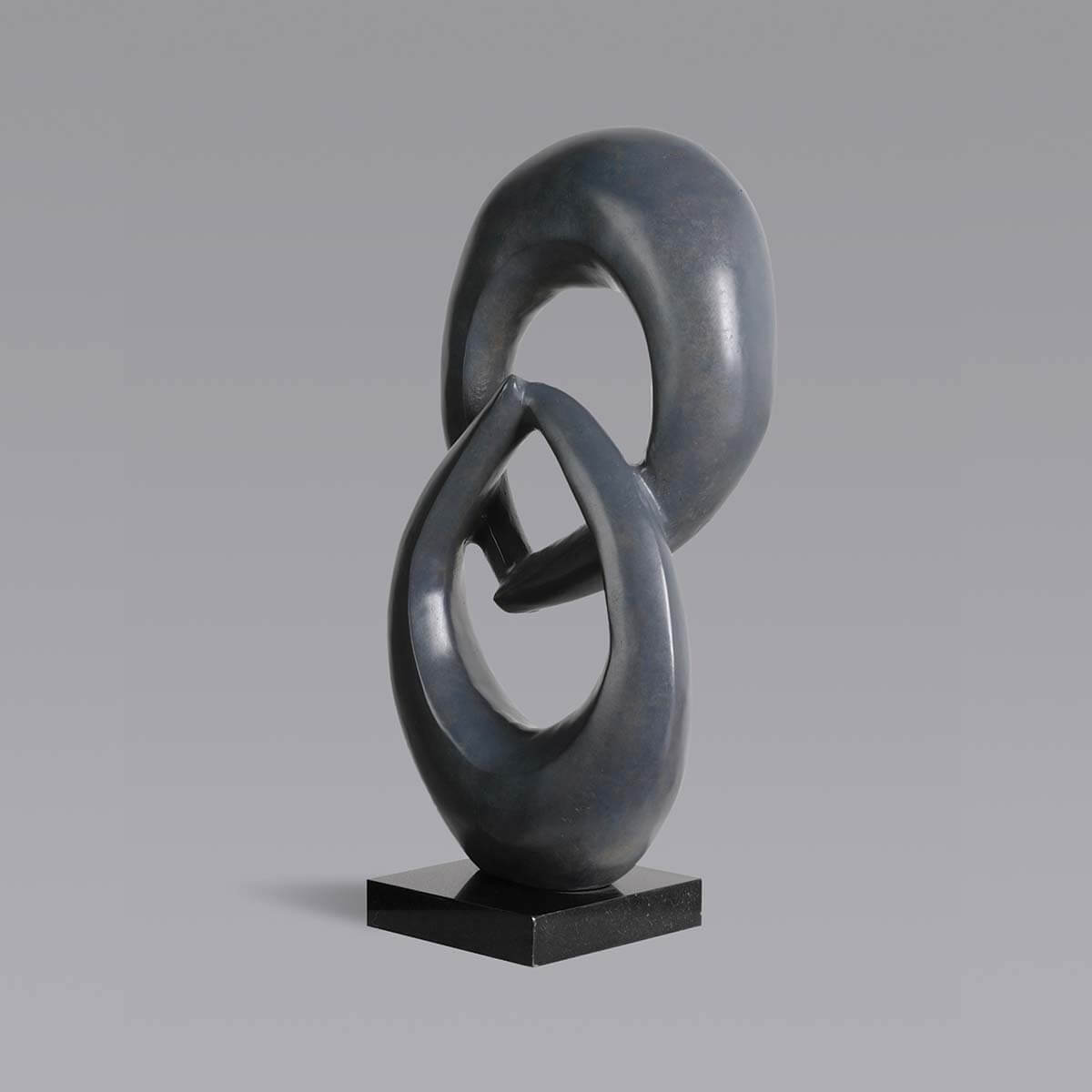An abstract sculptural composition defined by interlocking forms and fluid continuity. The dark bronze finish enhances depth and contrast, creating a bold yet balanced presence within contemporary interiors.