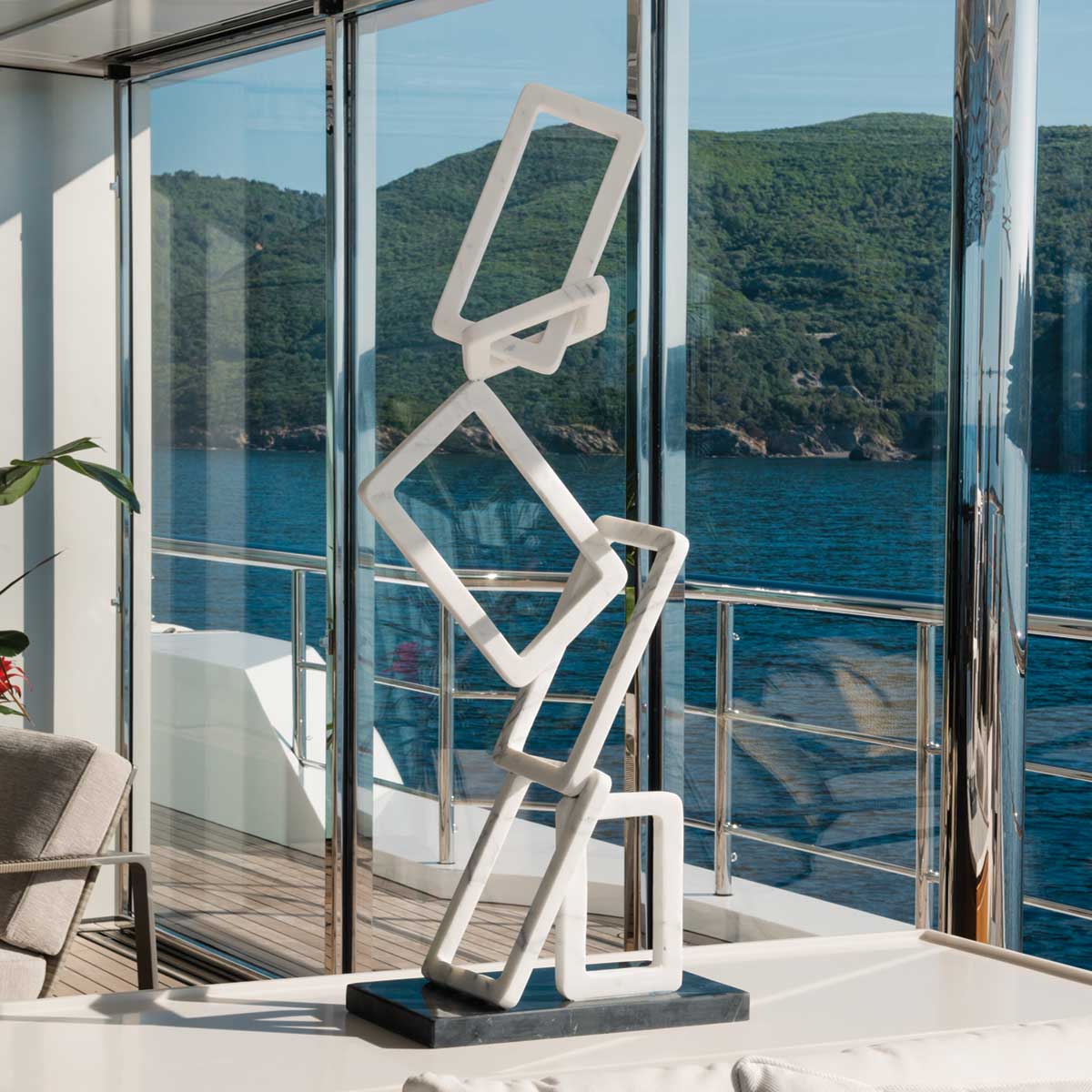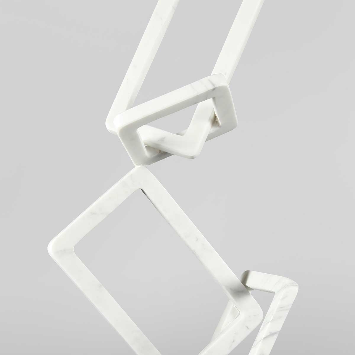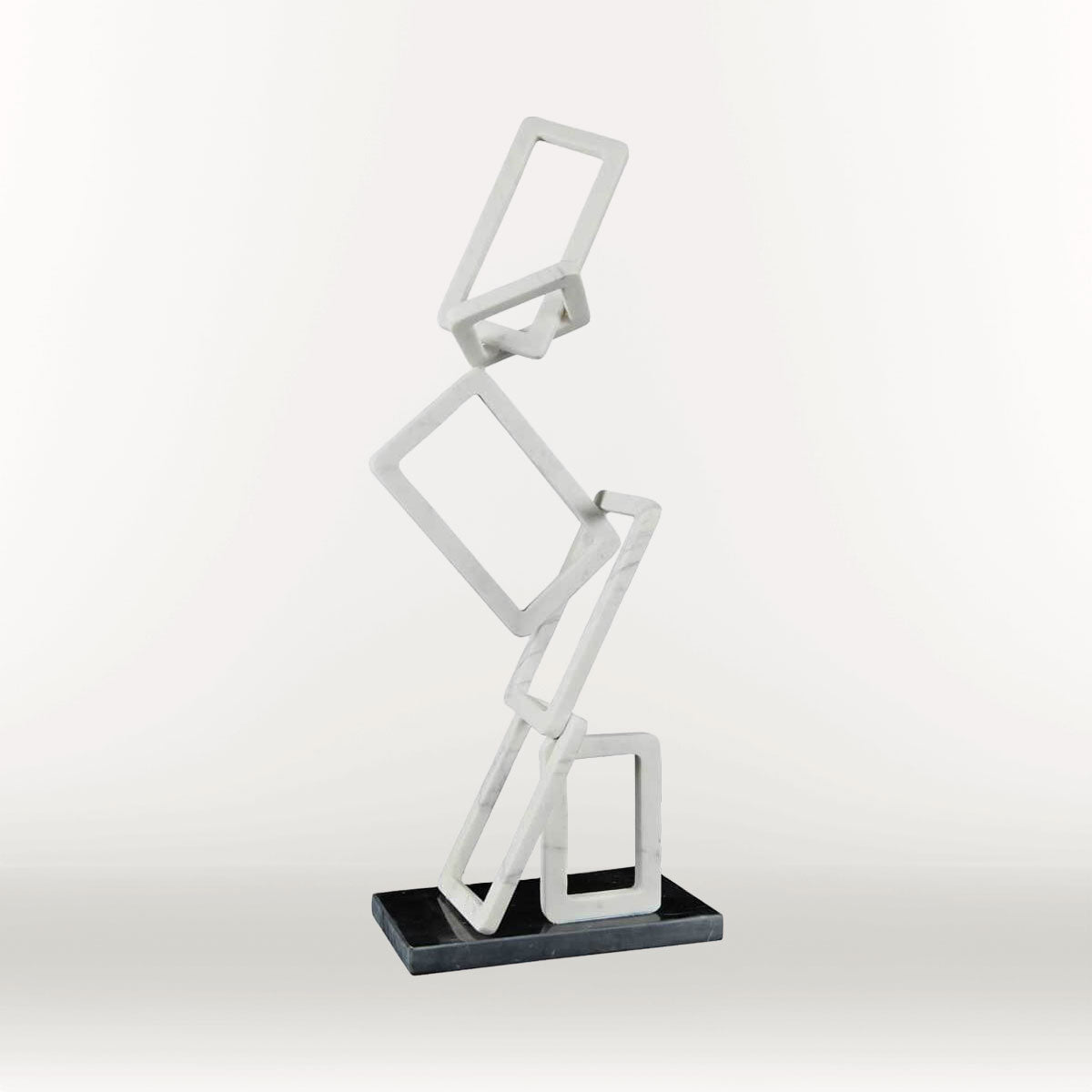 An abstract marble sculpture composed of intersecting geometric forms and vertical rhythm. Its architectural structure explores balance and movement, creating a bold and contemporary sculptural presence.